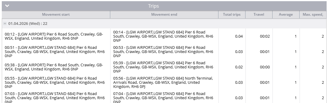 A Trip Report shows the start and end of each journey for an asset. It tracks movement from the moment the asset begins moving until it stops for a defined period.